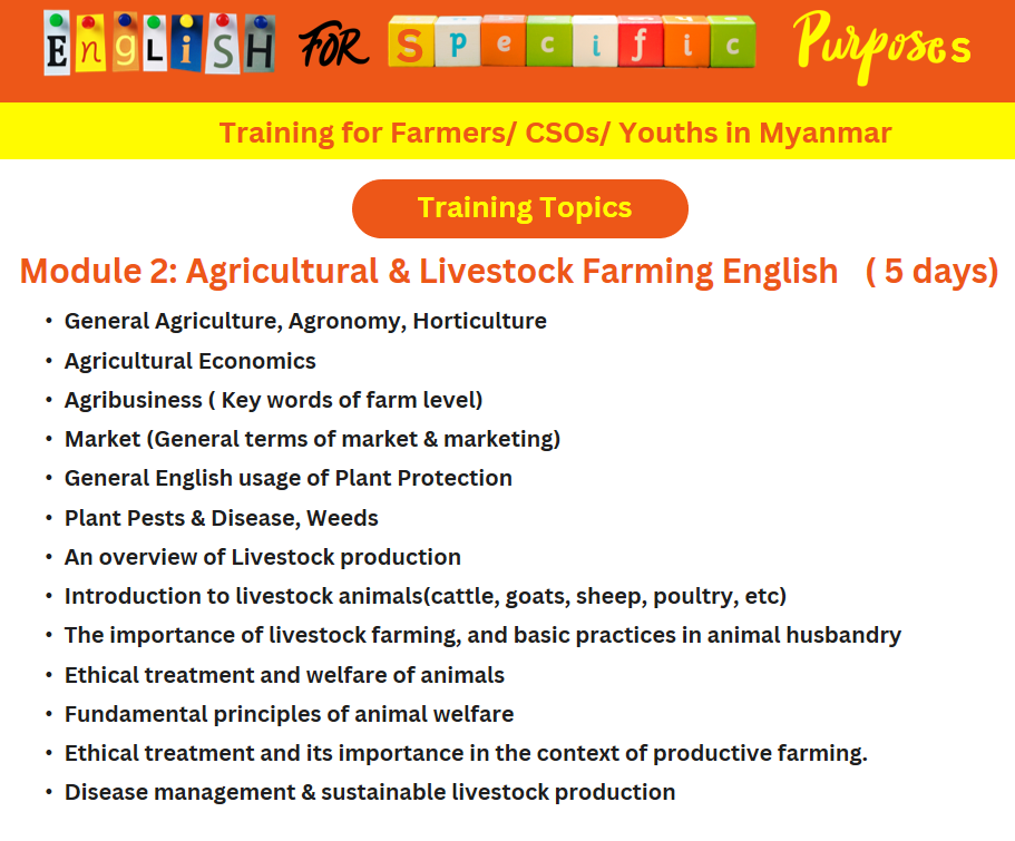 စိုက်ပျိုးရေးနှင့် မွေးမြူရေးလုပ်ငန်းသုံး အင်္ဂလိပ်စာ အရေး၊ အဖတ်များ ရင်းနှီးကျွမ်းဝင်စေရန်